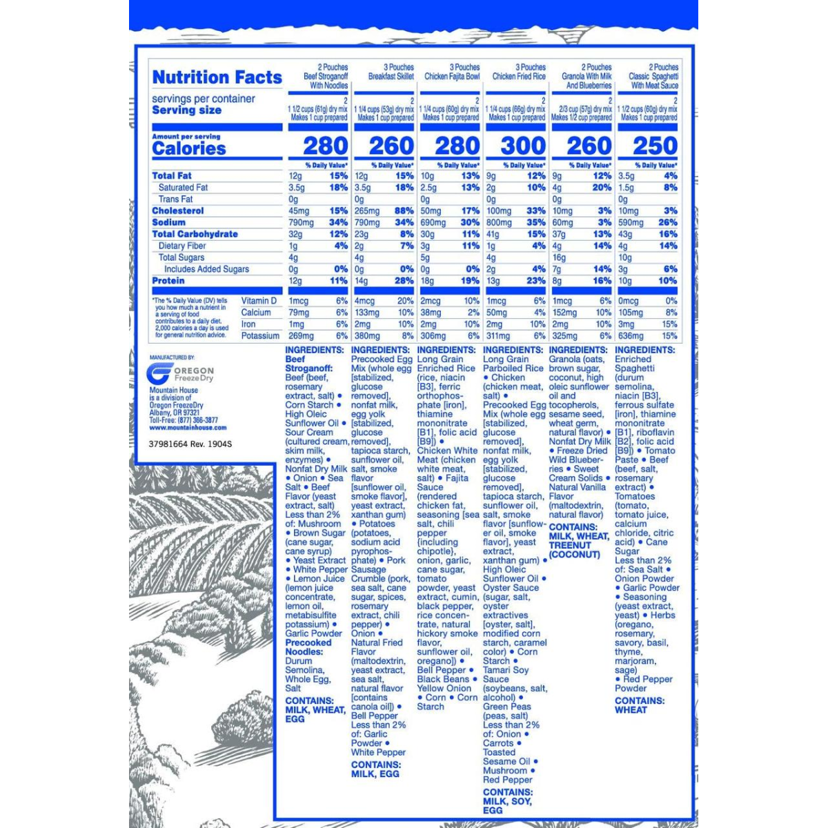 БЕЗ ВИКОРИСТОВНИХ СМАКІВ І ЦВІТІВ. У вартість входить: (3) пакетика сковороди для сніданку, (2) гранола з молоком і чорницями, (2) бефстроганів, (3) миски фахіта з куркою, (3) смажений рис із куркою та (2) Класичні спагеті з м“ясним соусом.