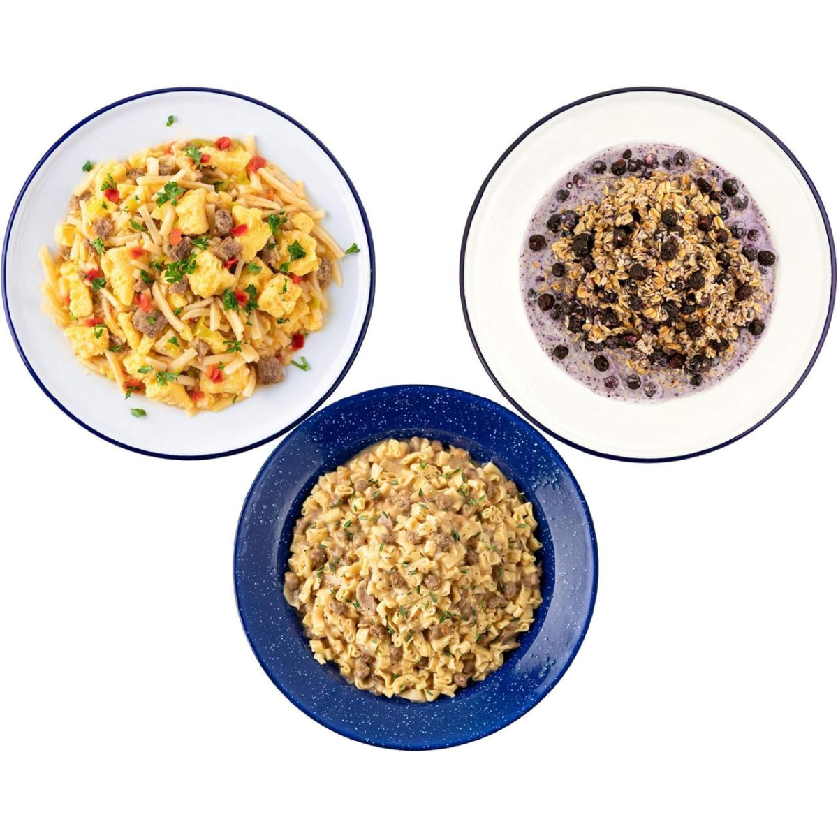 (3) пакетика сковороды для завтрака, (2) гранола с молоком и черникой, (2) бефстроганов, (3) миски фахита с курицей, (3) жареный рис с курицей и (2) Классические спагетти с мясным соусом. |