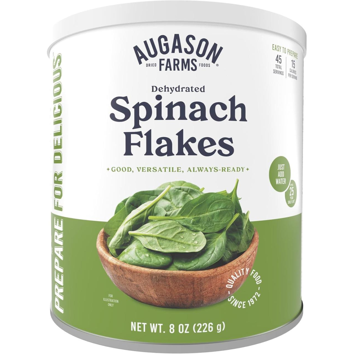 Сублімовані продукти тривалого зберігання 25 років (до липня 2050 року!) Augason Farms - Spinach Flakes 45 порцій Чиста вага продукту: 226 грамів Вага банки: 542 грама Висота банки: 17,5см Діаметр банки: 15,5см Спосіб приготування: залити водою, додати 1/2 чайної ложки солі. Довести до кипіння, зменшити вогонь. Варити 10 хвилин. За бажанням можна додати 1/2 ложки цукру. Злийте воду, подавайте до столу. На нашому сайті вкреті “сублімовані продукти“ є сублімати різних компаній-лідерів американського ринку сублімованих продуктів тривалого зберігання до 30 років. Компанія Augason Farms працює з 1972 року. Також у розділі “виживання/бушкрафт“ є майларові пакети та поглиначі кисню PackFreshUSA для самостійного заготівлі продуктів на термін до 30 років.