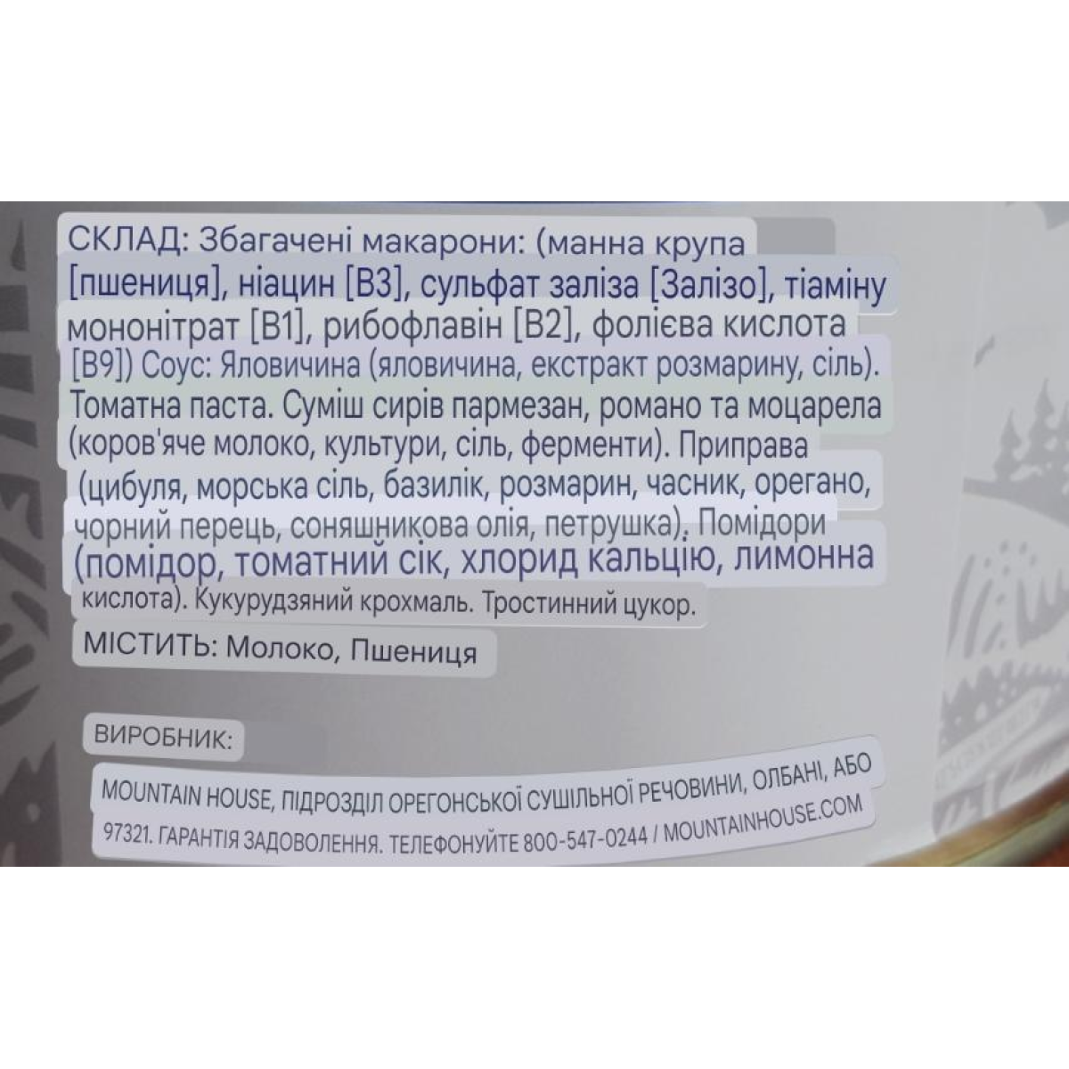 Збагачені макарони: (манна крупа [пшениця], ніацин [B3], сульфат заліза [железо], мононітрат тіаміну [B1], рибофлавін [B2], фолієва кислота [B9]) Соус: яловичина (яловичина, екстракт розмарину, сіль), томатна паста, суміш сирів пармезан, романо та моцарела (коров“я молоко, розчини, сіль, ферменти), приправа (лук, морська сіль, базилік, розмарин, часник, орегано, чорний перець, соняшникова олія, петрушка), помідори (помідори, томатний сік, хлорид кальцію, лимонна кислота), кукурудзяний крохмаль, тростинний цукор МІСТИТЬ: молоко, пшеницю; Будь ласка, ознайомтеся зі складом продукту на етикетці, щоб перевірити всі компоненти цього продукту
