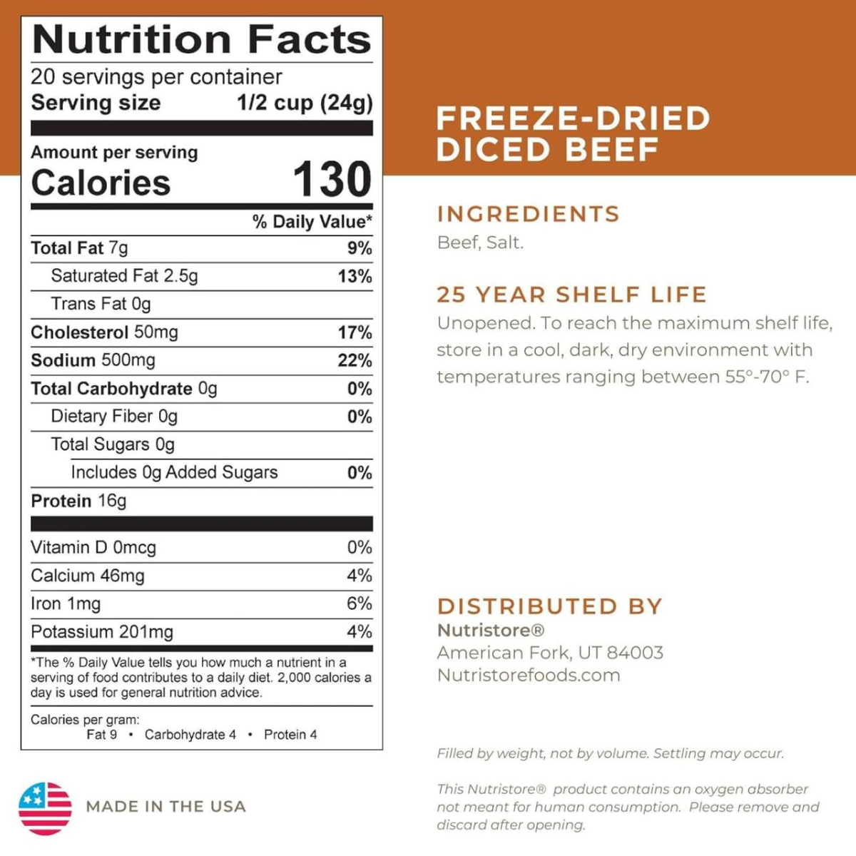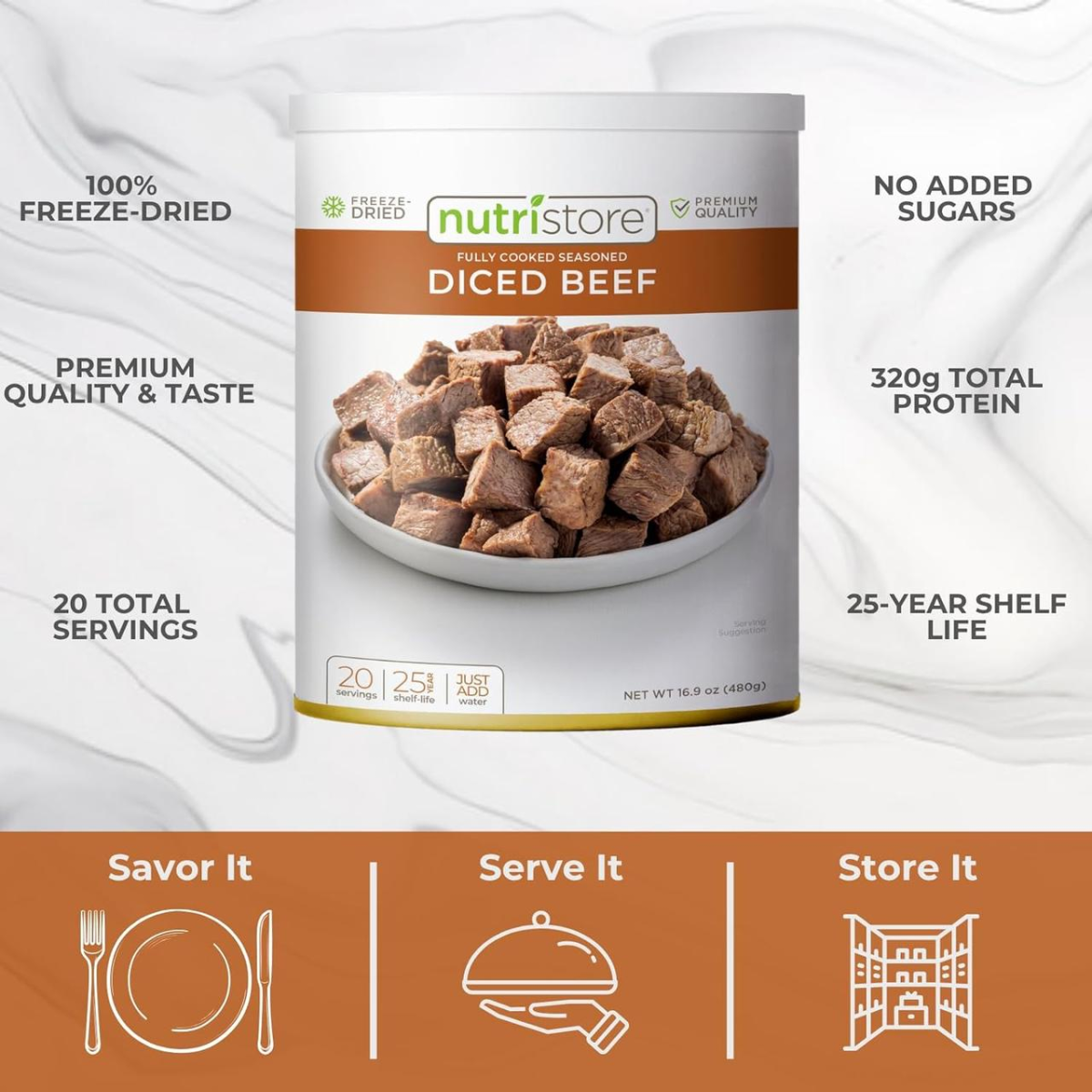 Сублімовані яловичи кубики Nutristore | Готове м“ясо для походів, кемпінгу та приготування їжі | Довгостроковий запас продуктів для виживання | Термін придатності 25 років | Паковання No 10 банок | Зроблено в США | 20 порцій
