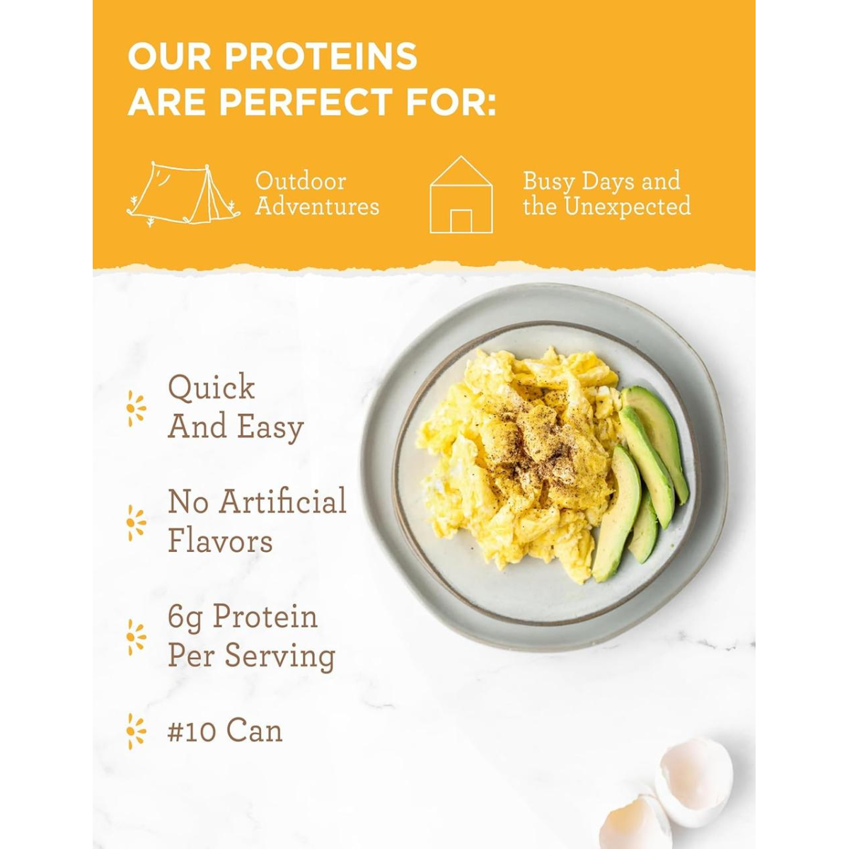 Яєчний порошок поживний і ситний у багатьох видах. Любите ви сухий яєчний порошок у формі омлетів або закусок швидкого приготування або несолодких страв, готових до домашніх рецептів, наш консервований яєчний порошок Simple Kitchen забезпечить вас свіжими, якісними інгредієнтами з тривалим терміном зберігання. Наші сублімовані яйця стануть незамінним продуктом у коморі, коли свіжі яйця недоступні або занадто швидко псуються. Їх зручно розводити та додавати в домашні обіди та вечері, або є прямо з паковання. Вони також ідеально підходять для порційного використання як сухі закуски, коли ви готуєте їжу на ходу, або для збагачення сніданків і випічки.
