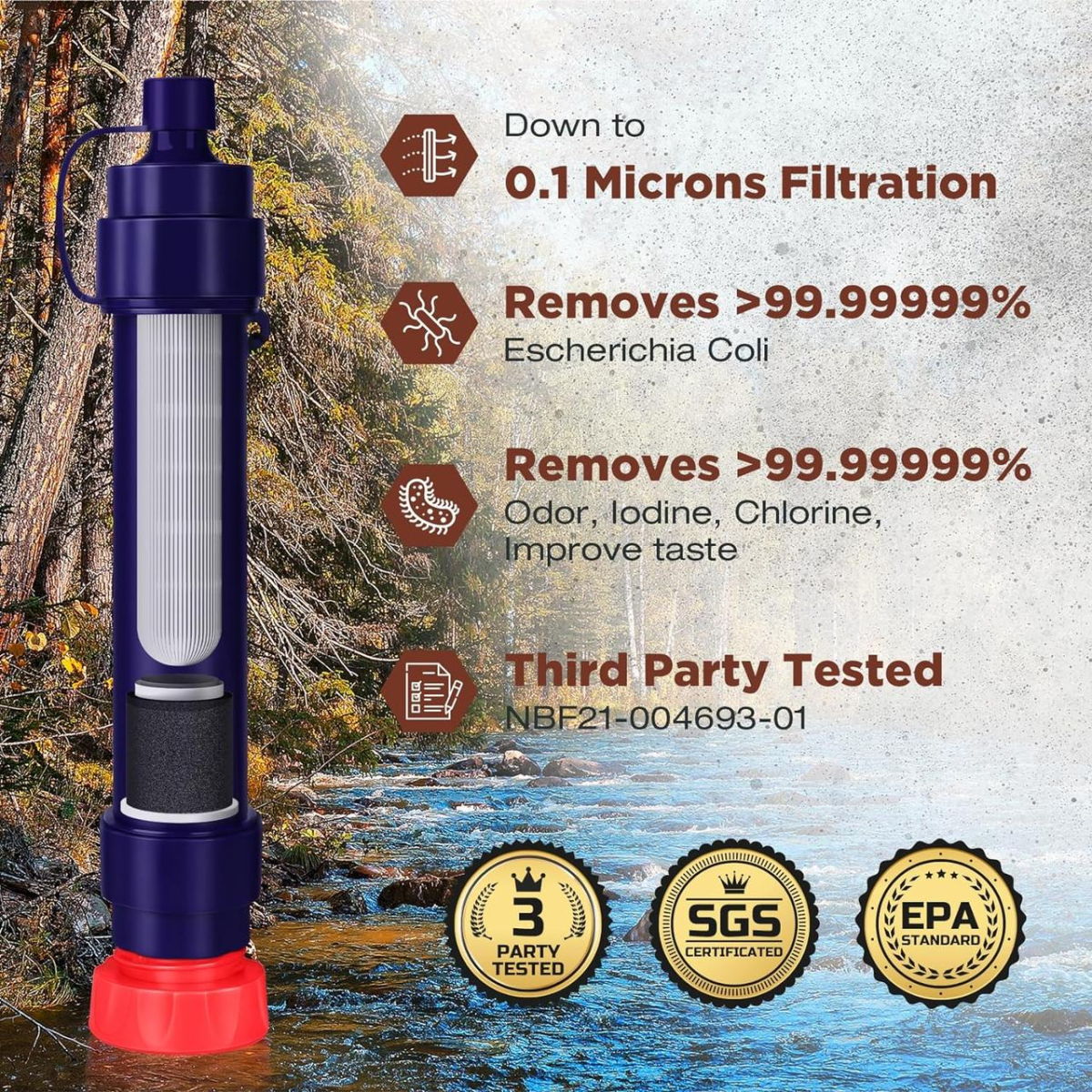 Безпечніший інструмент для виживання: відповідає стандартам фільтрів EPA. Харчові матеріали та матеріали, які не містять BPA, гарантують безпеку питної води. Ідеальний інструмент для різних цілей, як-от туристичне спорядження, туристичне спорядження, дорожні аксесуари, спорядження для безпеки та виживання в кемпінгу, а також предмети для підготовки до надзвичайних ситуацій. Навіть похідний фільтр для води також підійде як подарунок туристам.