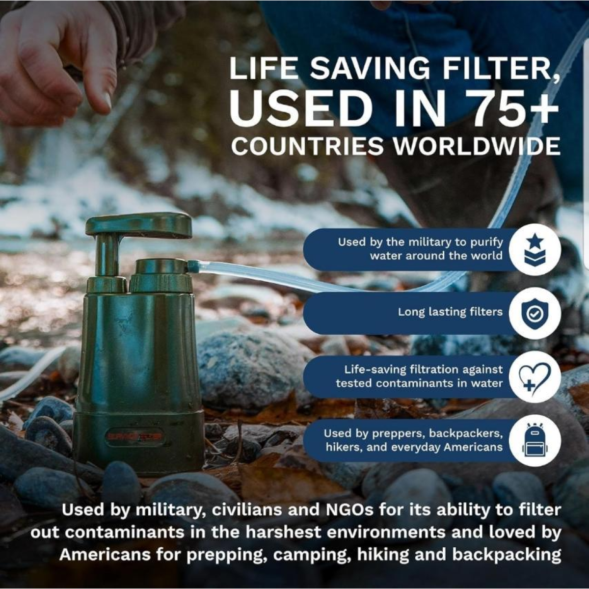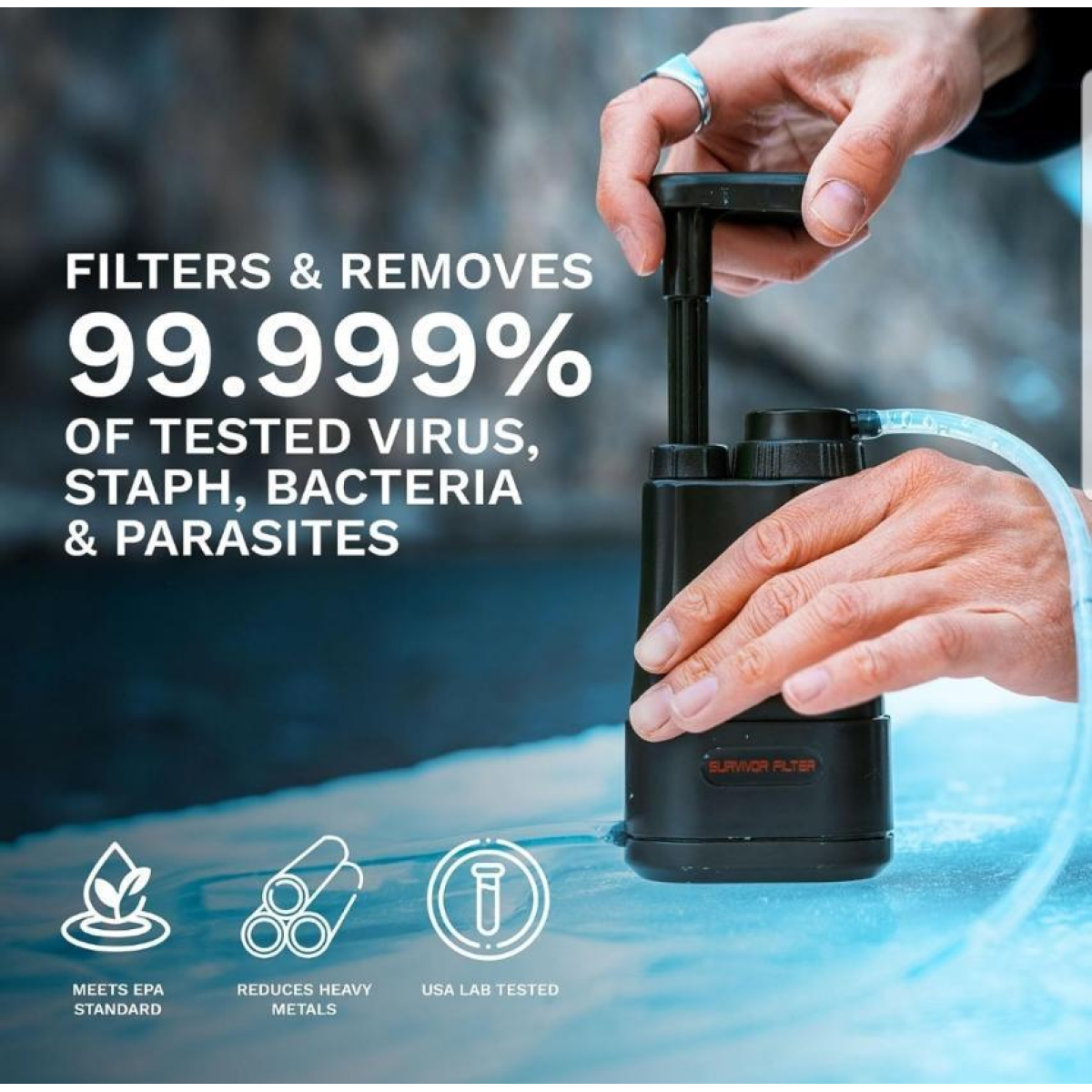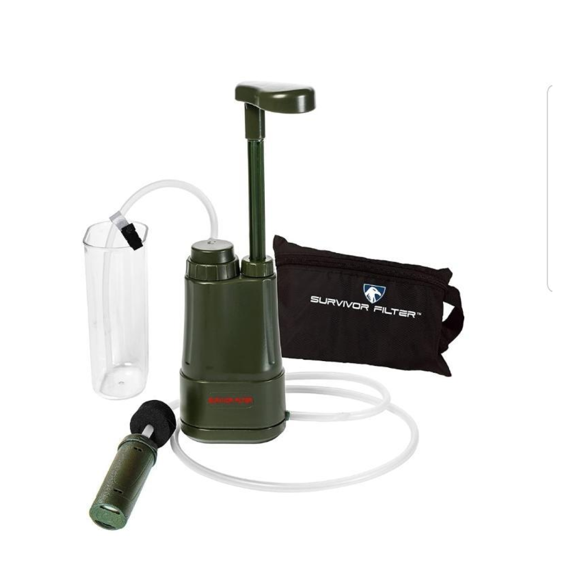 Похідний фільтр для води Survivor Filter PRO Ресурс 100итих літрів Вага: 365 грамів Швидкість фільтрації 0,5 літра на хвилину. Затримує як органіку, так і віруси. Розміри: 8см х 5см х 16.5см Ця модель виробляється з 2014 року та завоювала на Амазон позитивний рейтинг і багато позитивних відгуків. Компактний і простий у використанні — вага 12,8 унцій, це легкий і компактний похідний фільтр для води. Система фільтрації води, схвалена для виживання, походів, кемпінгу та пішого туризму. Фільтр для води Backpacking — Простий у використанні фільтр для води. З цим похідним фільтром для води не потрібно заряджати або чекати на чисту воду. У комплекті чашка, сумка, фільтри, трубки та інструкція з експлуатації. Супершвидка витрата — Цей фільтр для води для виживання має швидку витрату 500 мл (17 унцій) за хвилину. Використовуйте прямо з будь-якого джерела прісної води, перебуваючи в дорозі. Стандарти тестування — фільтр для очищення води без BPA для кемпінгу. Видаляє 99,999% перевірених вірусів, стафілококів, бактерій і найпростіших і знижує вміст важких металів відповідно до стандартів NSF/ANSI.