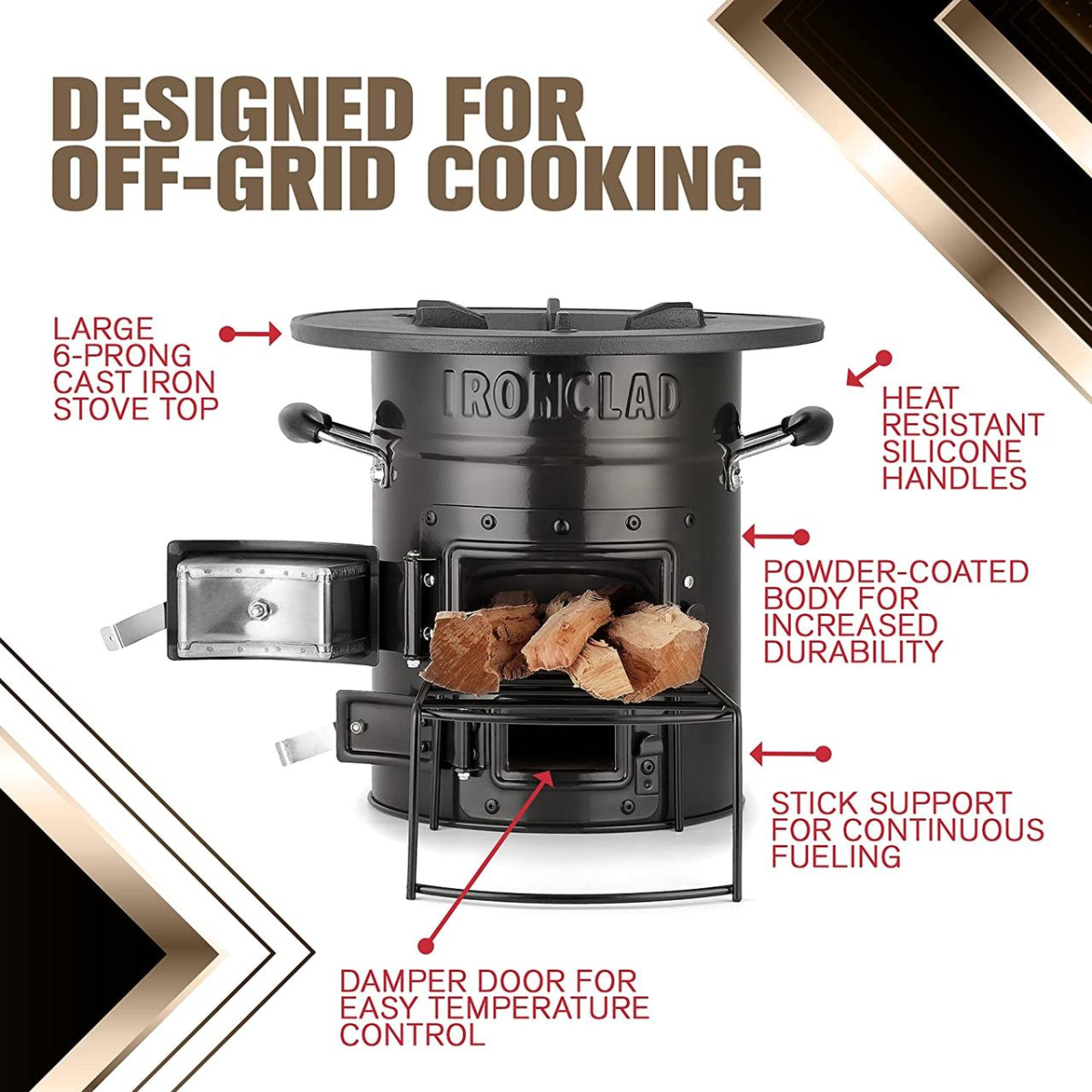 ІДЕАЛЬНО ДЛЯ АВТОНОМНОГО ЖИТТЯ Й ГОТОВОСТІ ДО АВАРІЙНИМ СІТУАЦІЯМ — Немає потреби в газі, пропані або електриці. Портативна кемпінгова піч Ironclad Supply використовує як паливо тверду біомасу, як-от деревина, а це означає, що ви можете приготувати повноцінний обід і закип“ятити воду для своєї сім“ї в будь-якому місці та в будь-який час. Його ефективна конструкція означає, що все, що вам потрібно для приготування цілої їжі, — це лише кілька паличок! Ідеальна аварійна піч для будь-якої ситуації.