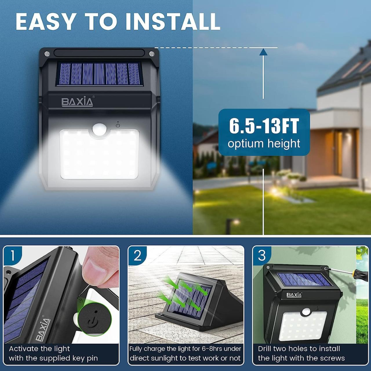 ☀ 【Вологозахист і термостійкість IP65】 Якщо ви шукаєте довговічні настінні світильники на сонячних батареях, які слугуватимуть довгі роки, наші сонячні світильники ідеально відповідають цим вимогам. Виготовлений із високоміцного АБС-пластику та високоякісної сонячної панелі, сонячний ліхтар BAXIA спеціально розроблений для роботи в екстремальних погодних умовах. Він старанно працюватиме, щоб освітити ваш дім навіть у дощовитий, вітряний або сніговий день.