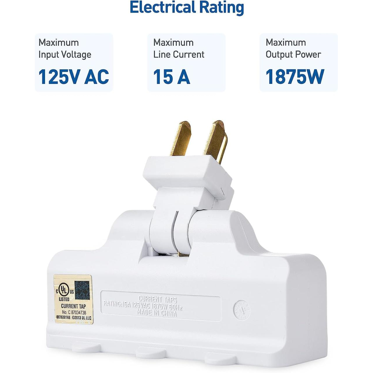 Вага 140 грамів Ширина 9 см Висота 4 см Глибина включно з металевими контактами 8 см Глибина під час транспортування (зігнутий під 90градусів) 5 см Колір білий. Куплений у США на Amazon. 3- драговій АДАПТЕР БИЛИКИ створює 3 розетки з однієї заземленої розетки; Ідеальне рішення для розміщення декількох шнурів під столом або за меблями. Поворотна розетка на 180 ГРАДУСІВ повертається для під“єднання шнурів вгору, вниз або вперед; Регульований поворотний адаптер можна розташувати так, щоб не блокувати верхню розетку одногрупової розетки змінного струму. МІЧНА І БЕЗПЕЧНА конструкція цього заземленого поворотного адаптера з 3 розетками розрахована на номінальну потужність 15 А/1875 Вт; Просте встановлення в стандартну заземлену вертикальну розетку змінного струму.
