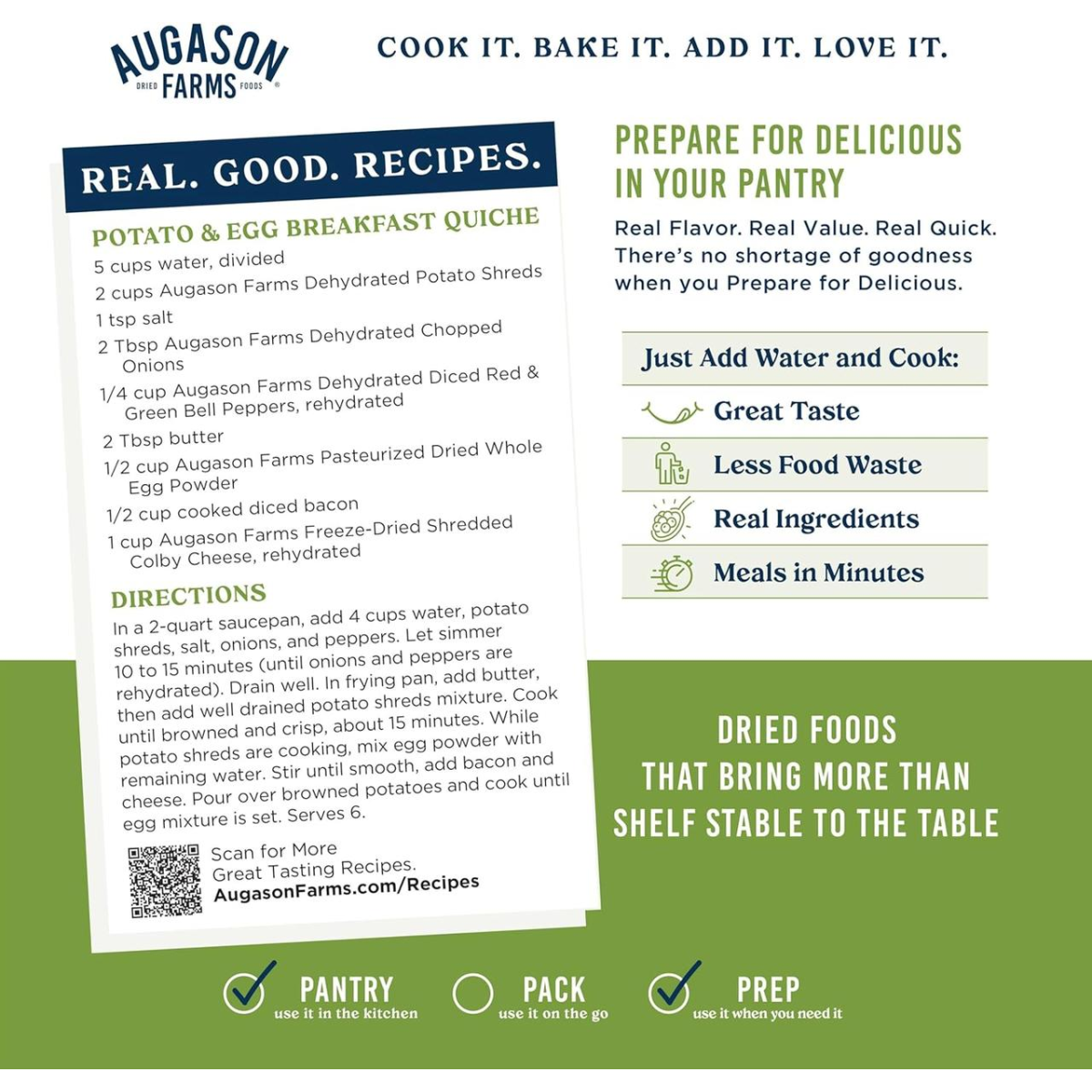 Від перевіреного виробника: Augason Farms — це компанія, якій сім“ї довіряють якісні дегідровані продукти. Наші інгредієнти, відомі своєю свіжістю, смаком і якістю, забезпечують сім“ям спокій і гарантують їм їжу, на яку вони можуть покластися.