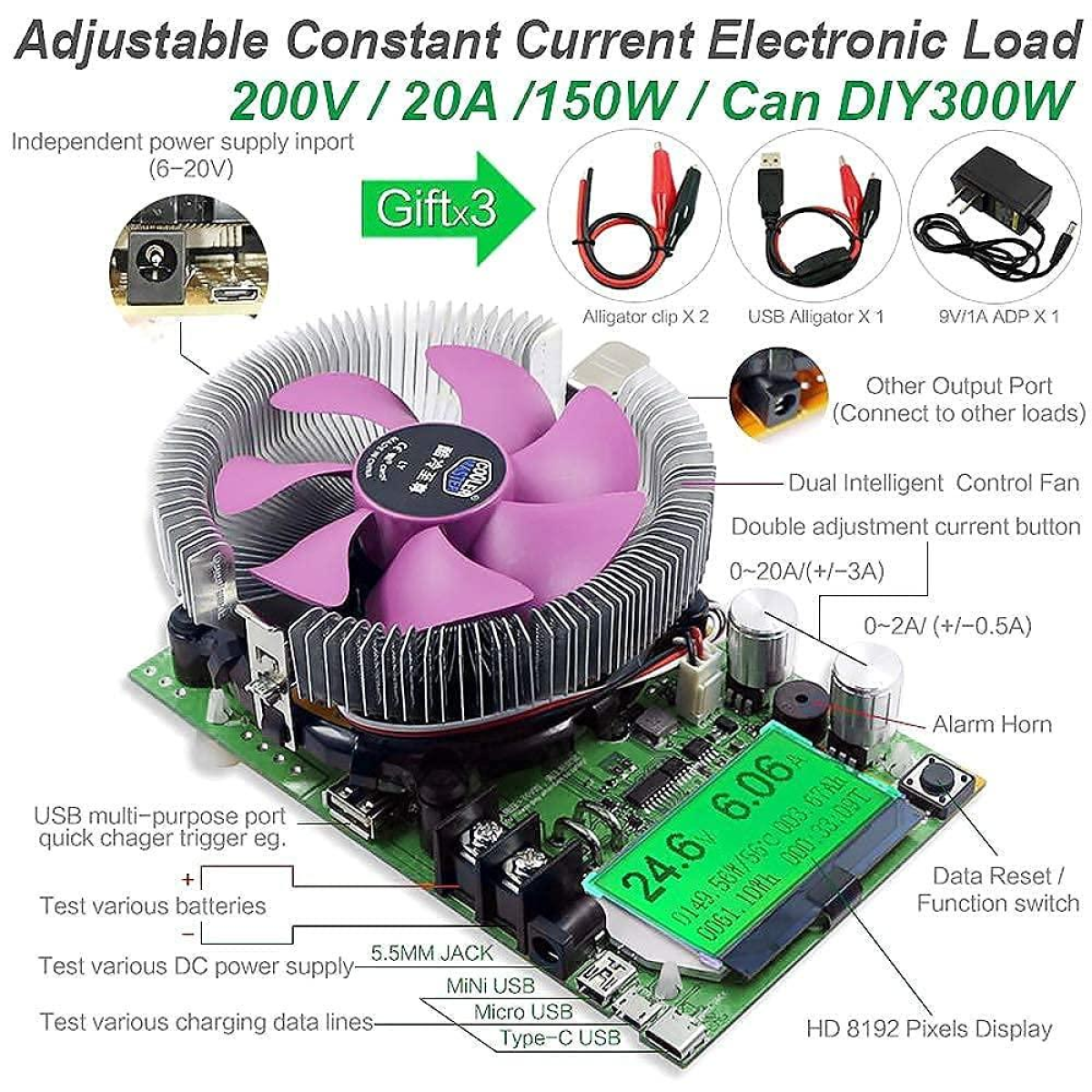 Товар привезений зі США (Амазон). Електронний тестер навантаження MakerHawk — тестер навантаження USB 150 Вт 200 В 20 А Резистор Регульований постійний струм Модуль тестера ємності акумулятора Інтелектуальний розрядник. Про цей товар (АВТОПЕРЕВІДК): Попередження про запобігання горінню: під час тестування батареї вхідної напруги та великої потужності доступ має бути перед використанням двох ручок регулювання струму проти годинникової стрілки до мінімуму до нуля, потім доступ відповідно до пріоритетом відповідно до поточної потужності для повільного регулювання ручки струму не має бути миттєво переданий infull, так що є надмірна миттєва потужність навантаження розрядна трубка згоріла величезний ризик! Будь ласка, зверніть особливу увагу на цей момент, спасибі! Два методи живлення: 1. Джерело живлення DC6-12V DC5.0; 2. Блок живлення DC6-12V Micro USB. Потужність розряду корпусу не може перевищувати 150 Вт, інакше є ризик перегоряння. Діапазон вимірювання напруги: 0,00 В ~ 200 В, діапазон вимірювання струму: 0,00 А ~ 20 А. Як працювати: Встановіть ємність, потужність, час, використовуючи метод натискання клавіш. Скидання: 1. Кнопка скидання Довгі всі дані (мА·год, 00:00:00); 2. Кнопка швидкого скидання ємності двічі (мА·год); 3. Швидка кнопка три скидання живлення (ㅁ); 4. Кнопка швидкого доступу Чотириразовий скидання (00:00:00); 5. Швидка кнопка п“ять режимів автоматичного режиму очікування, регулярний зворотний відлік розряду; 6. Вихід без навантаження Без навантаження, швидка сім клавіш, струм нульовий нульовий струм, точне калібрування температури довкілля. Потужність 150 Вт належить до: Відповідно до формули розрахунку потужності P = UI (потужність = напруга x струм); Вхід 10 В Струм розряду приблизно 18 А. Вхід 20 В Струм розряду приблизно 9 А. Вхід 30 В Струм розряду приблизно 6 А. Проконсультувати за цим товаром не вдасться. Дивіться відеообзори (є англомовні). Товар новий. Постівав 4-5 сонячних панелей, тестував роботу тестера.