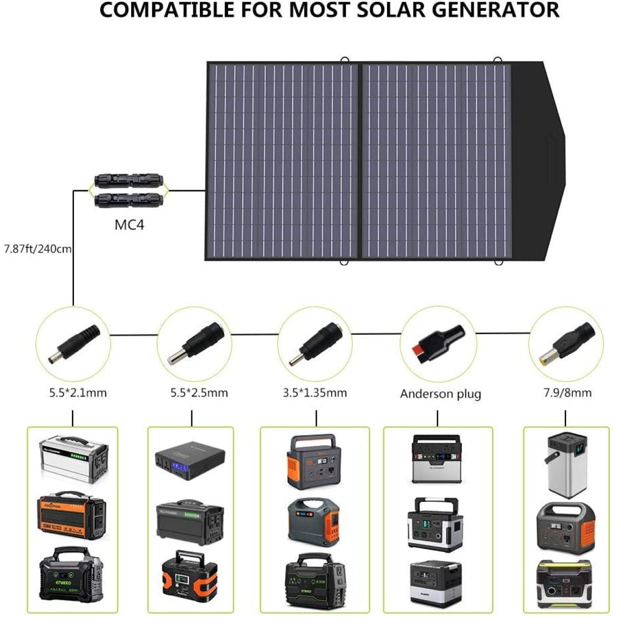 Будь ласка, не купуйте сонячну панель для заряджання ґаджетів у хмарну або похмуру погоду. Сонячна панель заряджає тільки під прямим сонячним промінням (без хмарного серпанку, без хмар, хмар). Повернення товару через брак заряджання за вищеперерахованих погодних умов — не приймається! ALLPOWERS Складана сонячна панель 100 Вт, комплект портативної сонячної панелі для портативної електростанції, сонячний генератор, зовнішній складаний сонячний зарядний пристрій для кемпінгу, ноутбуків, автобудингу, олива. Розмір у складеному вигляді: 51см 65см 3см Вага: 3,2 кг Зроблено для сонячного генератора: Складана сонячна панель ALLPOWERS 100 Вт сумісна з більшістю сонячних генераторів/переносних електростанцій на ринку. Комплект портативної сонячної панелі містить роз“єми різних розмірів для портативного генератора (MC-4 для черепаха/MC-4 для постійного струму). Висока ефективність: комплект портативних сонячних панелей ALLPOWERS потужністю 100 Вт (США), ефективність до 22%, на 1/3 легше, ніж у сонячного кремнію такої ж потужності. Загальна потужність збільшилася на 1/3, порівнюючи з тим же розміром комплекту портативної сонячної панелі. Складаний і портативний: розмір у складеному вигляді лише 20x25,6x1,2 дюйма, 7,9 фунта, портативна сонячна панель потужністю 100 Вт чудово підходить для подорожей по проторованих дорогах без доступу до електрики та не займе багато місця у вашій сумці. Складаний сонячний зарядний пристрій ALLPOWERS має вихід 1 MC-4 (макс. 25 А), забезпечуючи нескінченну потужність для ноутбука, електростанції в кемпінгу, на відкритому повітрі, в саду, автобудині та карате під сонцем. Водонепроникний і міцний: складана сонячна панель потужністю 100 Вт, виготовлена з міцного та водонепроникного нейлону та регульованого кронштейна для отримання найефективнішого сонячного світла. Зовнішній складаний сонячний зарядний пристрій сертифікований FCC, RoHS, CE. Технологія захисту від короткого замикання та перенапруги гарантує безпеку вас і ваших пристроїв. Вміст пачки: Складана сонячна панель ALLPOWERS 100 Вт, кабель MC-4 на 5,5x2,5 мм, кабель MC-4 на Anderson, адаптер постійного струму 8 мм, кабель 3,5x1, 35 мм, кабель постійного струму 5,5x2,1 мм, інструкція з експлуатації