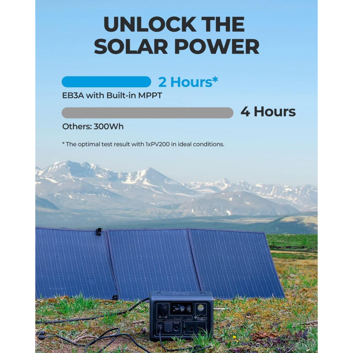 [Використовуйте силу сонця] — вбудований контролер MPPT підтримує вхідну потужність сонячної енергії до 200 Вт, що дає змогу вам створити ідеальний сонячний генератор із сонячною панеллю BLUETTI PV120/PV200.